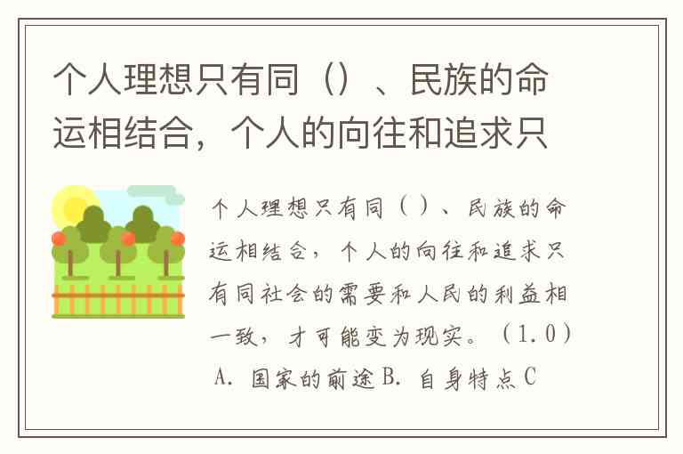 个人理想只有同()、民族的命运相结合,个人的向往和追求只有同社会的需要和人民的利益相一致,才可能变为现实。(1.0) A. 国家的前途 B. 自身特点 C. 家庭出身 D. 学历背景