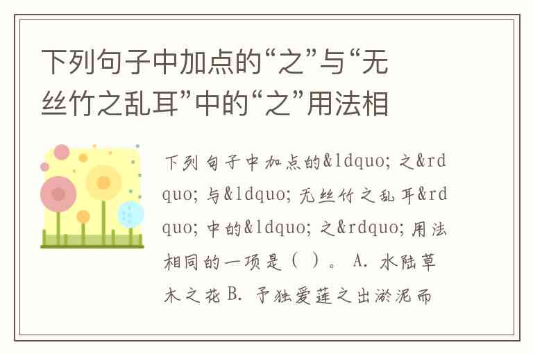 下列句子中加点的“之”与“无丝竹之乱耳”中的“之”用法相同的一项是( )。 A. 水陆草木之花 B. 予独爱莲之出淤泥而不染 C. 莲之爱,同予者何人 D. 何陋之有