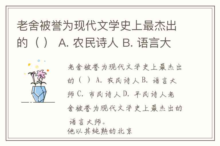 老舍被誉为现代文学史上最杰出的( ) A. 农民诗人 B. 语言大师 C. 市民诗人 D. 平民诗人