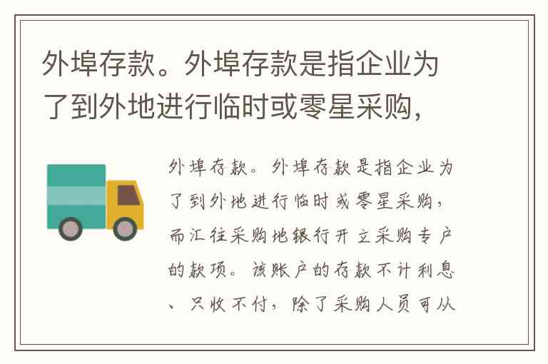 外埠存款是企业为到外地进行临时或零星采购,汇往采购地银行开立的采购专户存款。