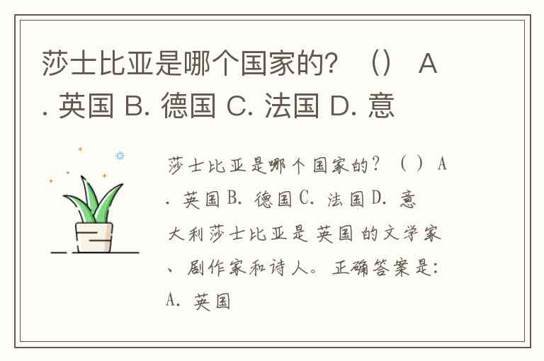 莎士比亚是哪个国家的?() A. 英国 B. 德国 C. 法国 D. 意大利