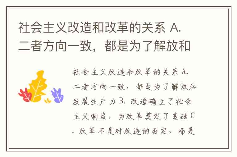 社会主义改造和改革的关系 A. 二者方向一致,都是为了解放和发展生产力 B. 改造确立了社会主义制度,为改革奠定了基础 C. 改革不是对改造的否定,而是继承、纠正、发展和自我完善 D. 二者都是社会主义发展过程中不可或缺的环节,二者是前后相继、紧密相连,不能彼此割裂、相互否定