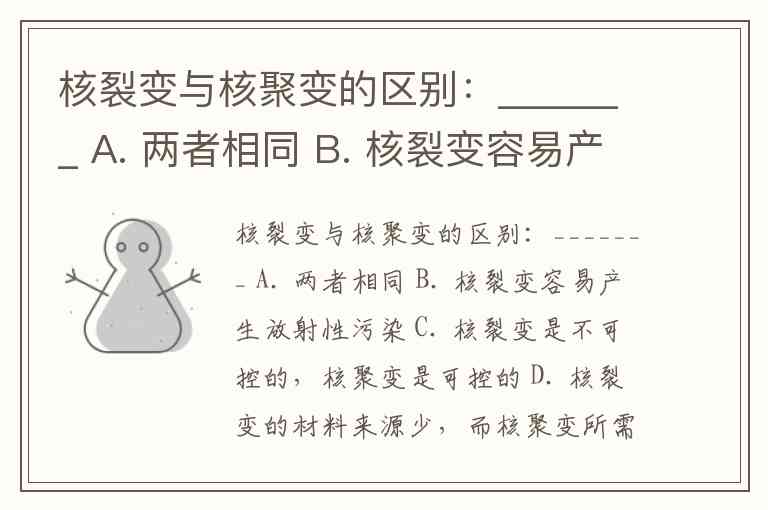 核裂变与核聚变的区别:_______ A. 两者相同 B. 核裂变容易产生放射性污染 C. 核裂变是不可控的,核聚变是可控的 D. 核裂变的材料来源少,而核聚变所需的材料来源广