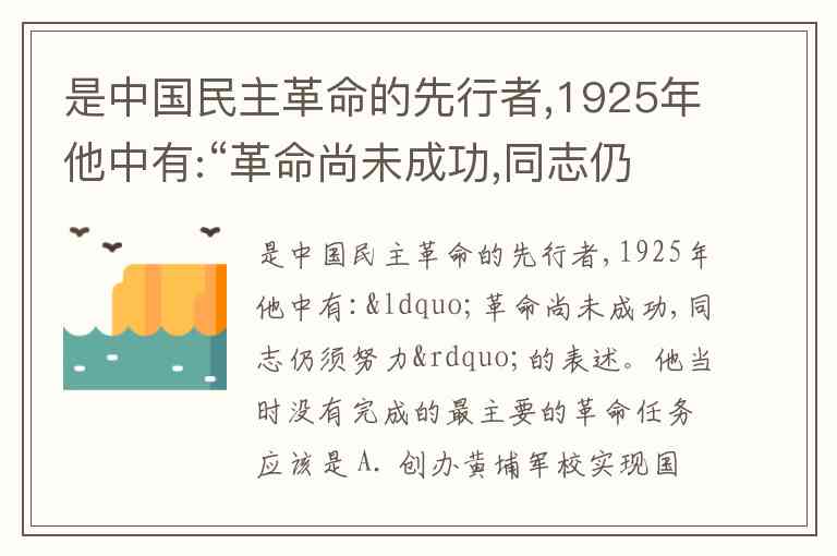 是中国民主革命的先行者,1925年他中有:“革命尚未成功,同志仍须努力”的表述。他当时没有完成的最主要的革命任务应该是 A. 创办黄埔军校实现国共合作 B. 推翻清王朝的封建 C. 改变半殖民地半封建社会的现状 D. 建立资产阶级共和国