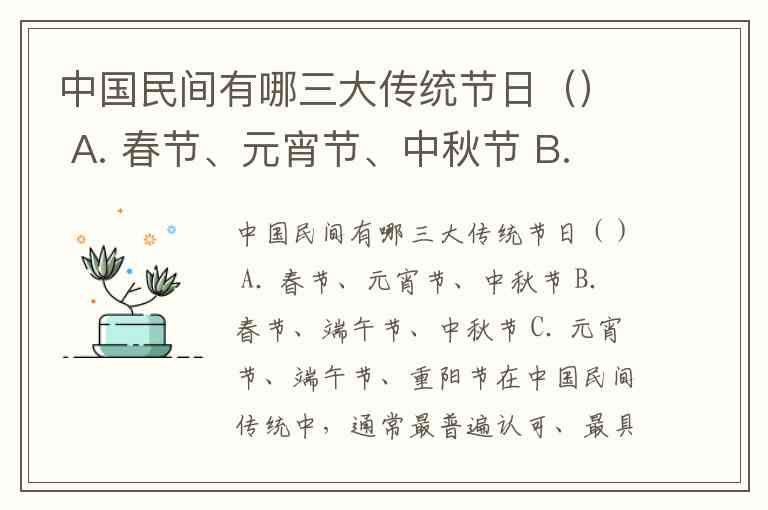 中国民间有哪三大传统节日() A. 春节、元宵节、中秋节 B. 春节、端午节、中秋节 C. 元宵节、端午节、重阳节