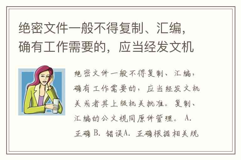 绝密文件一般不得复制、汇编,确有工作需要的,应当经发文机关或者其上级机关批准。复制、汇编的公文视同原件管理。 A. 正确 B. 错误