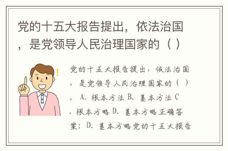 党的十五大报告提出,依法治国,是党领导人民治理国家的( )。 A. 根本方法 B. 基本方法 C. 根本方略 D. 基本方略