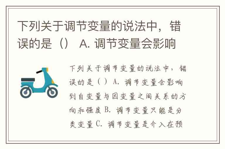 下列关于调节变量的说法中,错误的是() A. 调节变量会影响到自变量与因变量之间关系的方向和强度 B. 调节变量只能是分类变量 C. 调节变量是介入在预测变量与结果变量之间的变量