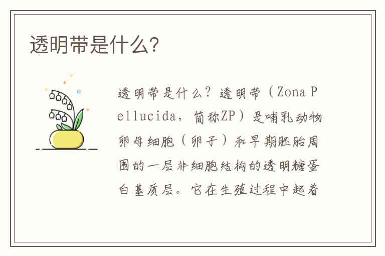 透明带(Zona Pellucida,简称ZP)是哺乳动物卵母细胞(卵子)和早期胚胎周围的一层非细胞结构的透明糖蛋白基质层。它在生殖过程中起着关键作用,主要由卵母细胞在发育过程中分泌形成。