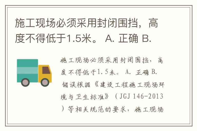 施工现场必须采用封闭围挡,高度不得低于1.5米。 A. 正确 B. 错误