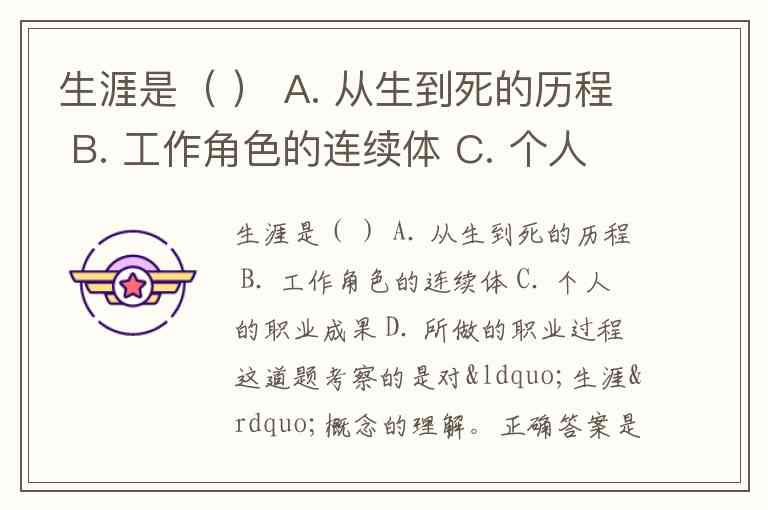 生涯是( ) A. 从生到死的历程 B. 工作角色的连续体 C. 个人的职业成果 D. 所做的职业过程