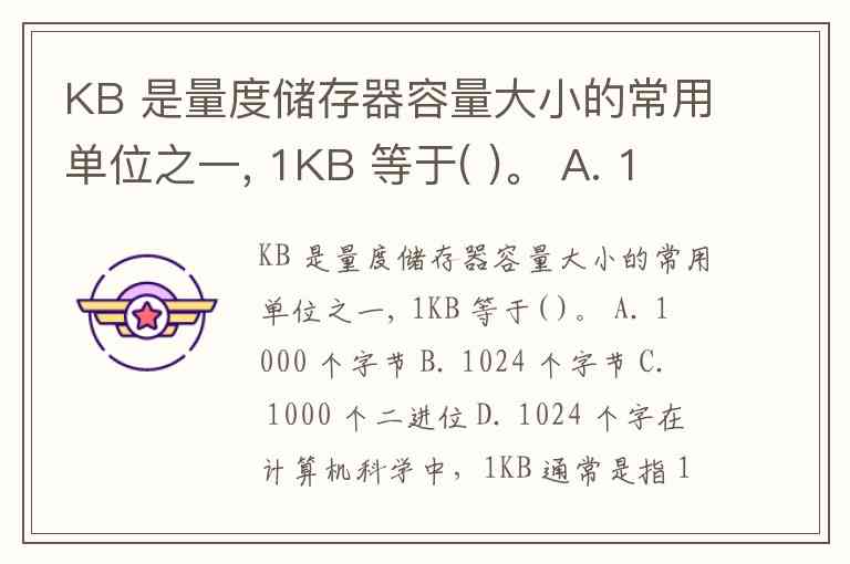 KB 是量度储存器容量大小的常用单位之一, 1KB 等于( )。 A. 1000 个字节 B. 1024 个字节 C. 1000 个二进位 D. 1024 个字