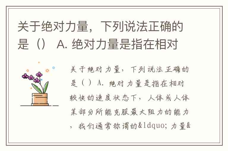 关于绝对力量,下列说法正确的是() A. 绝对力量是指在相对较快的速度状态下,人体或人体某部分所能克服最大阻力的能力,我们通常称谓的“力量”就是指它而言。 B. 绝对力量是指在相对较快的速度状态下,人体或人体某部分所能克服最小阻力的能力,我们通常称谓的“力量”就是指它而言。 C. 绝对力量是指在相对较慢的速度状态下,人体或人体某部分所能克服最大阻力的能力,我们通常称谓的“力量”就是指它而言。 D. 绝对力量是指在相对较慢的速度状态下,人体或人体某部分所能克服最小阻力的能力,我们通常称谓的“力量”就是指它而言。