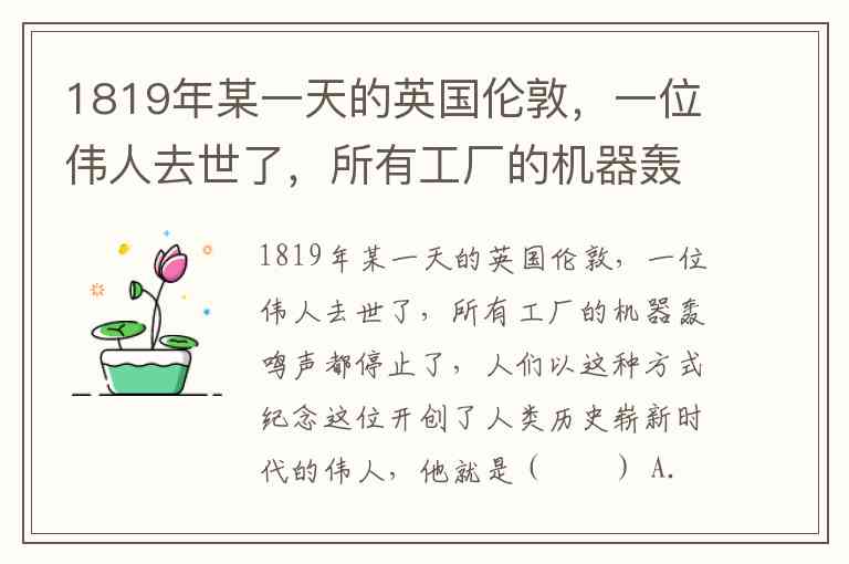 1819年某一天的英国伦敦,一位伟人去世了,所有工厂的机器轰鸣声都停止了,人们以这种方式纪念这位开创了人类历史崭新时代的伟人,他就是( ) A. 哈格里夫斯 B. 史蒂芬孙 C. 瓦特 D. 牛顿