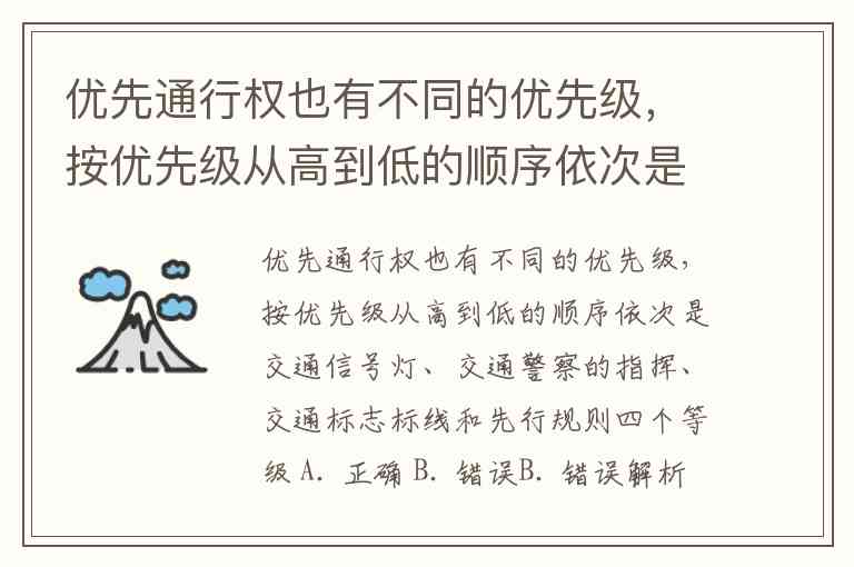 优先通行权也有不同的优先级,按优先级从高到低的顺序依次是交通信号灯、交通警察的指挥、交通标志标线和先行规则四个等级 A. 正确 B. 错误