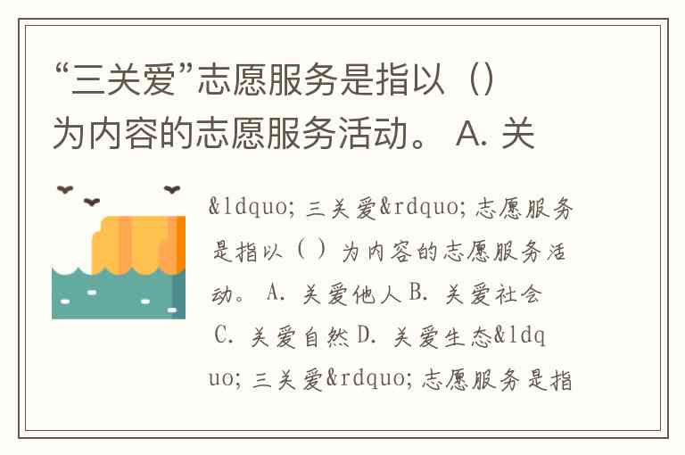 “三关爱”志愿服务是指以()为内容的志愿服务活动。 A. 关爱他人 B. 关爱社会 C. 关爱自然 D. 关爱生态