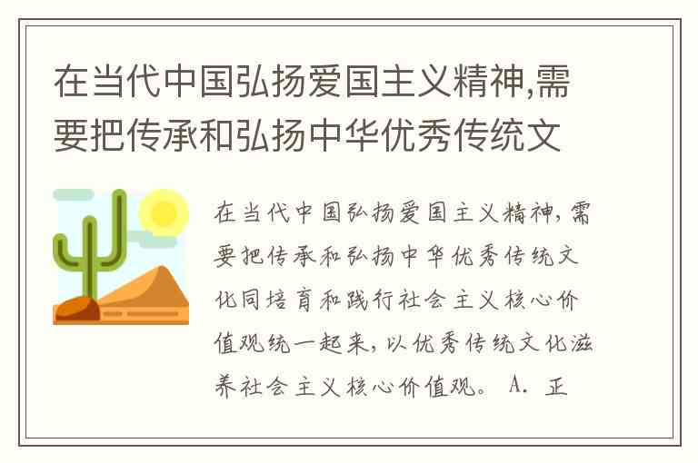 在当代中国弘扬爱国主义精神,需要把传承和弘扬中华优秀传统文化同培育和践行社会主义核心价值观统一起来,以优秀传统文化滋养社会主义核心价值观。 A. 正确 B. 错误