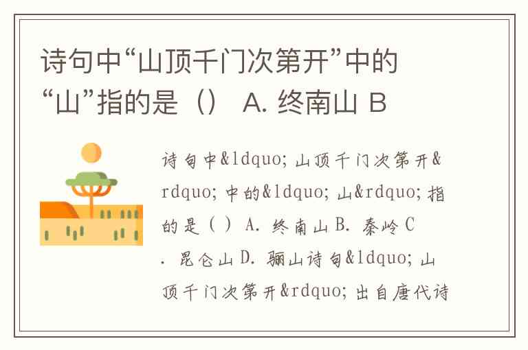 诗句中“山顶千门次第开”中的“山”指的是() A. 终南山 B. 秦岭 C. 昆仑山 D. 骊山