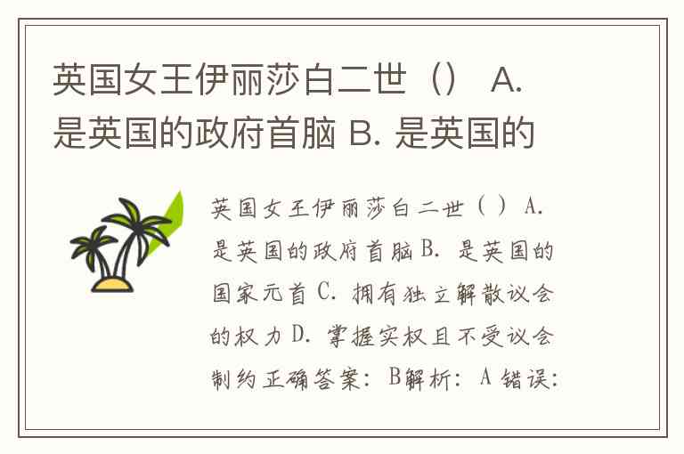 英国女王伊丽莎白二世() A. 是英国的政府首脑 B. 是英国的国家元首 C. 拥有独立解散议会的权力 D. 掌握实权且不受议会制约