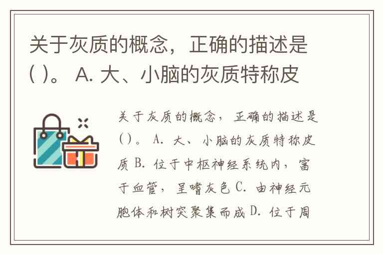 关于灰质的概念,正确的描述是( )。 A. 大、小脑的灰质特称皮质 B. 位于中枢神经系统内,富于血管,呈嗜灰色 C. 由神经元胞体和树突聚集而成 D. 位于周围神经系统内