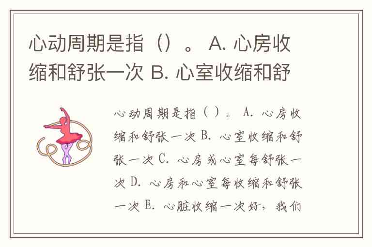 “心动周期”的定义在生理学中是指心脏一次完整的收缩和舒张活动所经历的时间过程。
