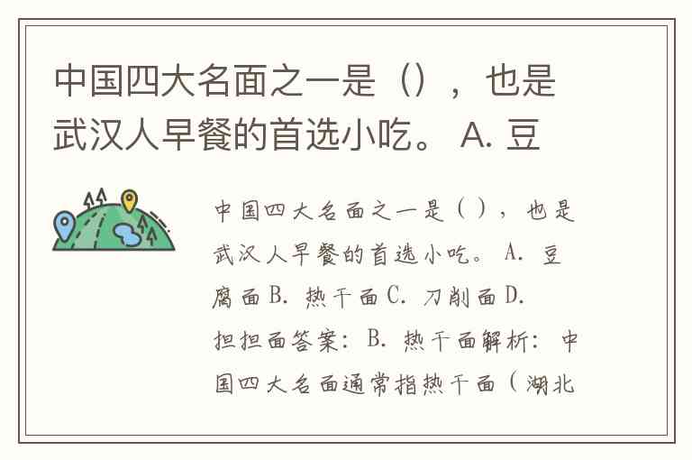 中国四大名面之一是(),也是武汉人早餐的首选小吃。 A. 豆腐面 B. 热干面 C. 刀削面 D. 担担面