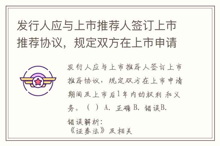 发行人应与上市推荐人签订上市推荐协议,规定双方在上市申请期间及上市后1年内的权利 和义务。( ) A. 正确 B. 错误