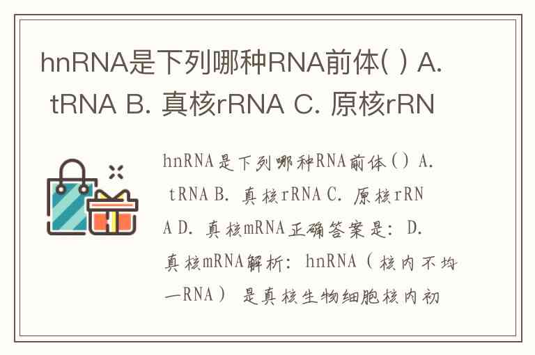 hnRNA是下列哪种RNA前体( ) A. tRNA B. 真核rRNA C. 原核rRNA D. 真核mRNA