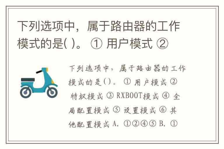 下列选项中,属于路由器的工作模式的是( )。 ① 用户模式 ② 特权模式 ③ RXBOOT模式 ④ 全局配置模式 ⑤ 设置模式 ⑥ 其他配置模式 A. ①②④⑤ B. ①②④⑤⑥ C. ①②③④⑤ D. ①②③④⑤⑥
