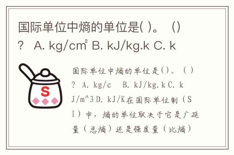 国际单位中熵的单位是( )。()? A. kg/c㎡ B. kJ/kg.k C. kJ/m^3 D. kJ/K