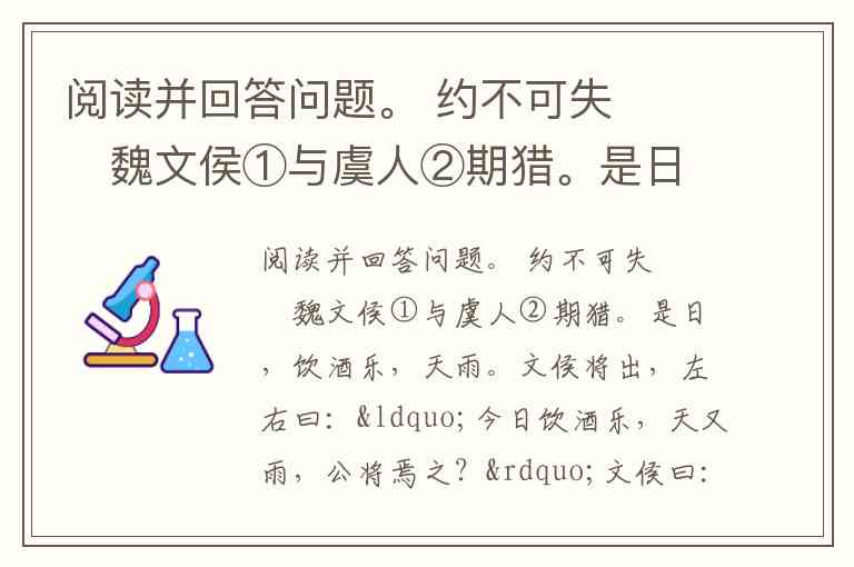 阅读并回答问题。 约不可失 魏文侯①与虞人②期猎。是日,饮酒乐,天雨。文侯将出,左右曰:“今日饮酒乐,天又雨,公将焉之?”文侯曰:“吾与虞人期猎,虽乐,岂可不一会期哉?”乃往,身自罢③之。(选自《魏文侯书》) 【注释】①魏文侯:战国时魏国国君,在诸侯中有美誉,曾任西门豹为螂守。②虞人:掌管山泽的官。③罢;停止,取消。1.解释下面加粗词的含义。①魏文侯与虞人期猎______________②是日,饮酒乐,天雨______________③公将焉之______________④岂可不一会期哉______________2.与“公将焉之”中“焉”字用法相同的一项是( )