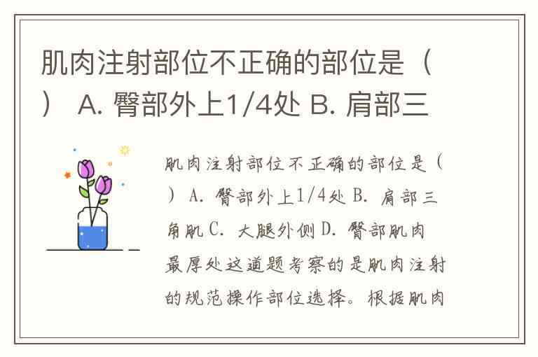 肌肉注射部位不正确的部位是() A. 臀部外上1/4处 B. 肩部三角肌 C. 大腿外侧 D. 臀部肌肉最厚处
