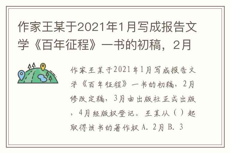 作家王某于2021年1月写成报告文学《百年征程》一书的初稿,2月修改定稿,3月由出版社正式出版,4月经版权登记。王某从()起取得该书的著作权 A. 2月 B. 3月 C. 1月 D. 4月