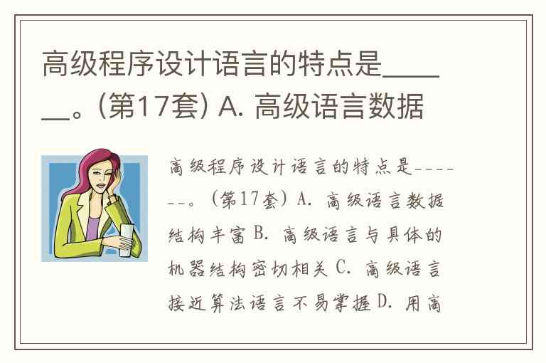 高级程序设计语言的特点是______。(第17套) A. 高级语言数据结构丰富 B. 高级语言与具体的机器结构密切相关 C. 高级语言接近算法语言不易掌握 D. 用高级语言编写的程序计算机可立即执行