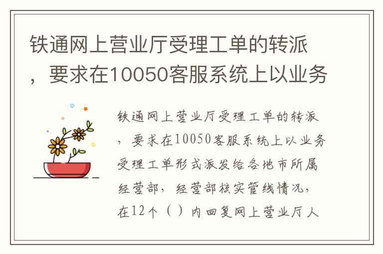 根据你描述的流程,铁通网上营业厅的业务受理工单在转派给各地市所属经营部后,需要经营部在 12小时 内回复网上营业厅人员-1;之后,工单处理人员应在 1小时 内通过电话或短信回复客户最终结果-9。