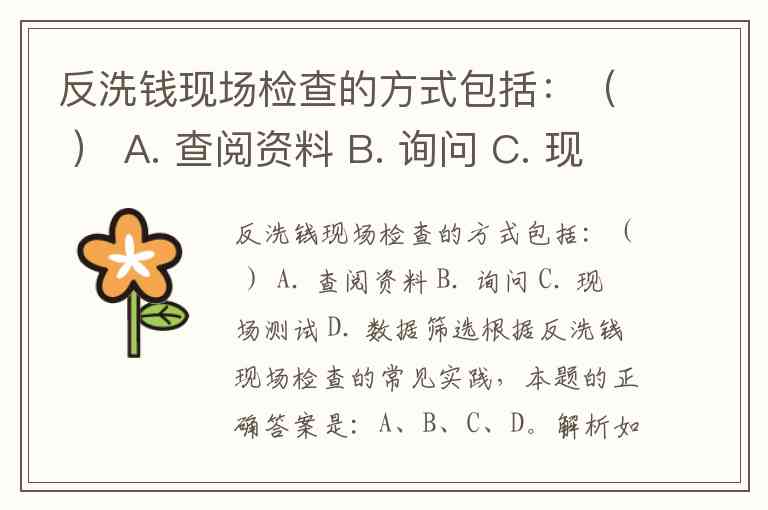 反洗钱现场检查的方式包括:( ) A. 查阅资料 B. 询问 C. 现场测试 D. 数据筛选
