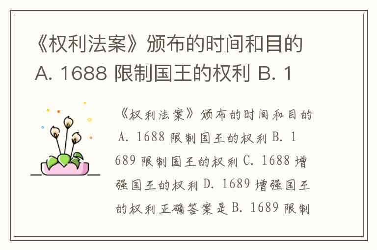 《权利法案》颁布的时间和目的 A. 1688 限制国王的权利 B. 1689 限制国王的权利 C. 1688 增强国王的权利 D. 1689 增强国王的权利