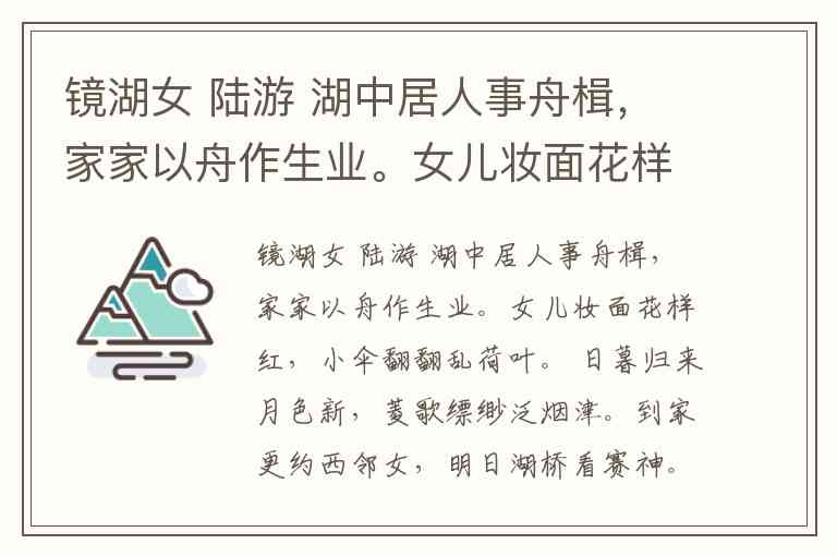 镜湖女 陆游 湖中居人事舟楫,家家以舟作生业。女儿妆面花样红,小伞翻翻乱荷叶。 日暮归来月色新,菱歌缥缈泛烟津。到家更约西邻女,明日湖桥看赛神。对本作品分析不恰当的一项是() A. “事舟楫”写湖边的人家日常靠船为生。 B. “乱荷叶”写女子摆动的伞把荷叶搅乱。 C. “月色新”写傍晚景色,暗示时间转换。 D. “泛烟津”写若有若无的歌声随波荡漾。