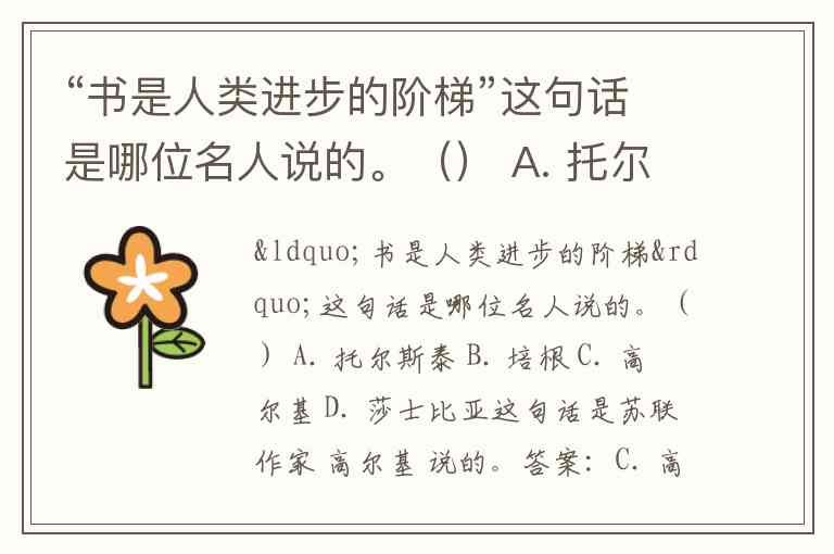 “书是人类进步的阶梯”这句话是哪位名人说的。() A. 托尔斯泰 B. 培根 C. 高尔基 D. 莎士比亚
