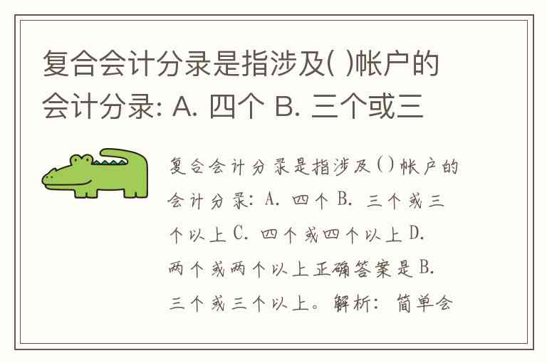 复合会计分录是指涉及( )帐户的会计分录: A. 四个 B. 三个或三个以上 C. 四个或四个以上 D. 两个或两个以上