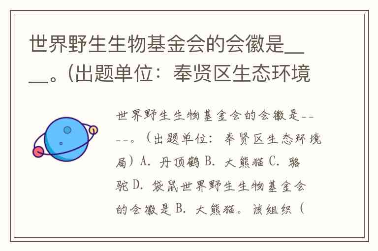 世界野生生物基金会的会徽是____。(出题单位:奉贤区生态环境局) A. 丹顶鹤 B. 大熊猫 C. 骆驼 D. 袋鼠