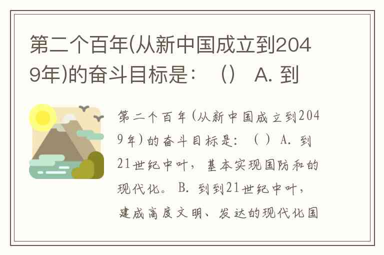 第二个百年(从新中国成立到2049年)的奋斗目标是:() A. 到21世纪中叶,基本实现国防和的现代化。 B. 到到21世纪中叶,建成高度文明、发达的现代化国家。 C. 建成富强民主文明和谐美丽的社会主义现代化强国。