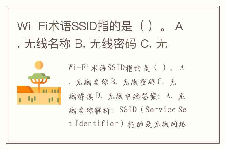 Wi-Fi术语SSID指的是( )。 A. 无线名称 B. 无线密码 C. 无线桥接 D. 无线中继