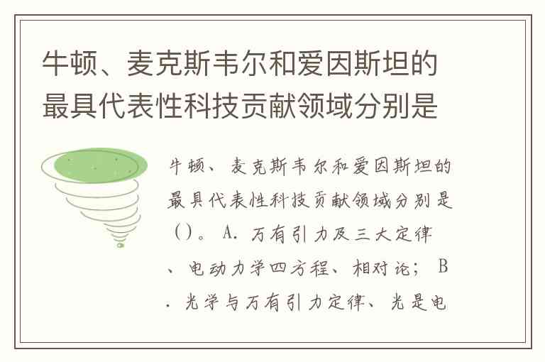 牛顿、麦克斯韦尔和爱因斯坦的最具代表性科技贡献领域分别是 ( )。 A. 万有引力及三大定律、电动力学四方程、相对论; B. 光学与万有引力定律、光是电磁波、光电效应; C. 三大定律、微电子技术理论、相对论; D. 三大定律与光学、电荷运动规律、量子力学 ;