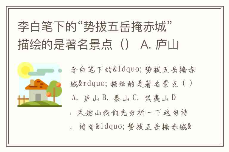 李白笔下的“势拔五岳掩赤城”描绘的是著名景点() A. 庐山 B. 泰山 C. 武夷山 D. 天姥山