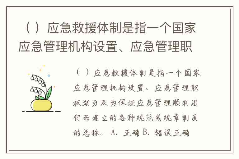 ( )应急救援体制是指一个国家应急管理机构设置、应急管理职权划分及为保证应急管理顺利进行而建立的各种规范或规章制度的总称。 A. 正确 B. 错误