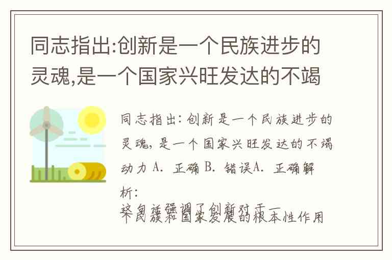 同志指出:创新是一个民族进步的灵魂,是一个国家兴旺发达的不竭动力 A. 正确 B. 错误