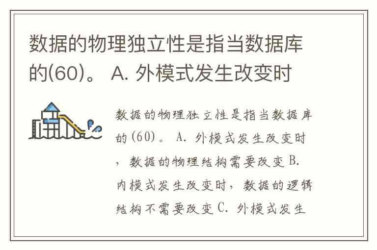 数据的物理独立性是指当数据库的(60)。 A. 外模式发生改变时,数据的物理结构需要改变 B. 内模式发生改变时,数据的逻辑结构不需要改变 C. 外模式发生改变时,数据的逻辑结构不需要改变 D. 内模式发生改变时,数据的物理结构不需要改变