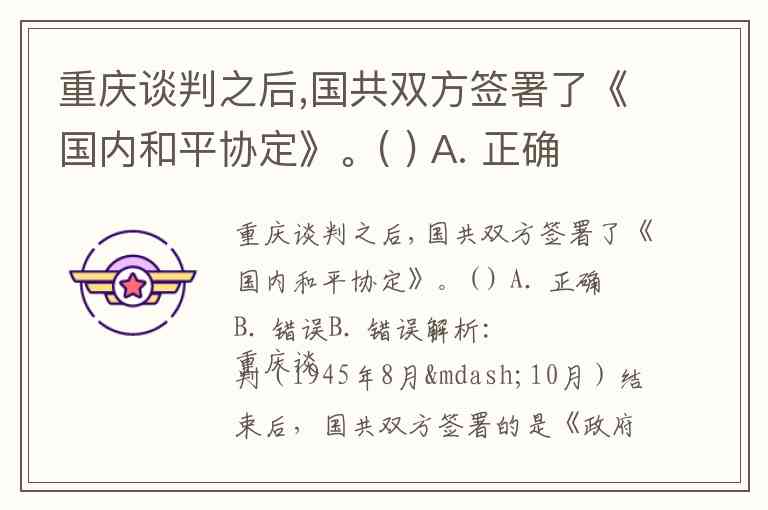 因此,题目中“重庆谈判之后,国共双方签署了《国内和平协定》”这一说法是错误的。