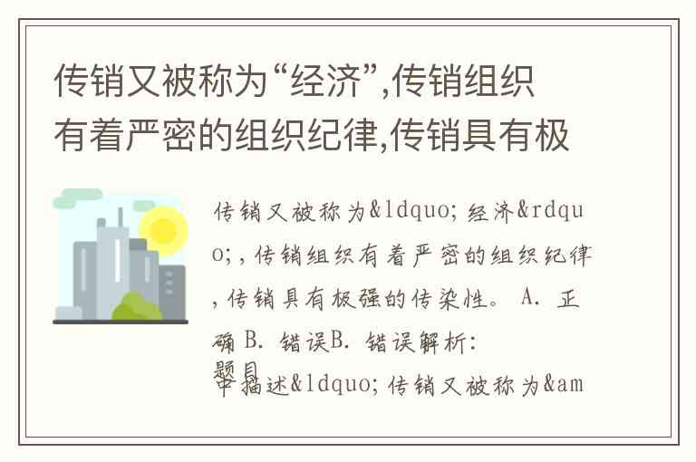 解析:题目中描述“传销又被称为‘经济’”,这一说法并不准确。传销通常被称为 “经济邪教” 或 “非法传销”,而不是简单的“经济”。而题目后半部分“传销组织有着严密的组织纪律,传销具有极强的传染性”是符合传销特点的描述,但整体来看,题干因为前半部分的命名错误而成为 错误表述。